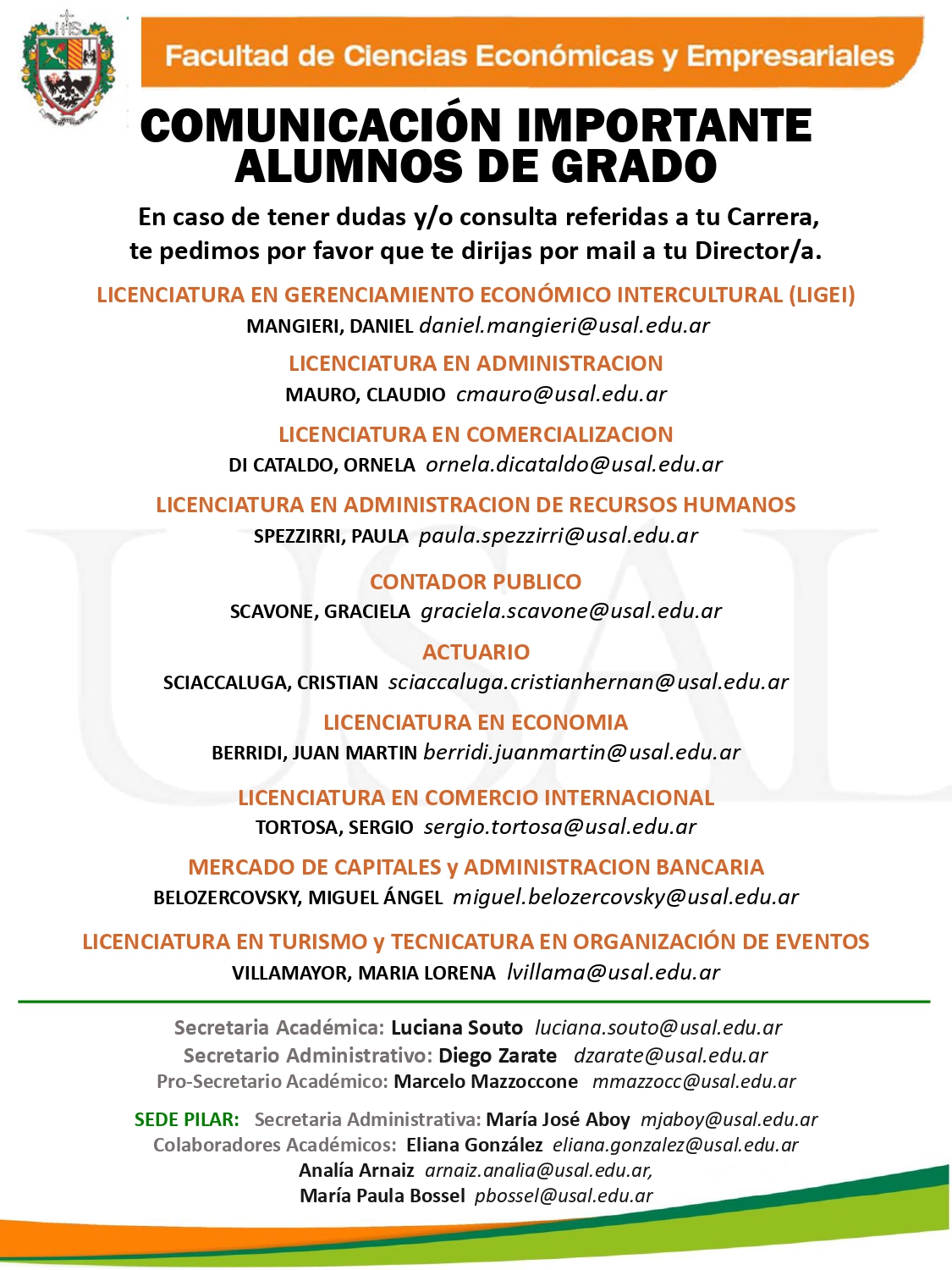 * Actuario, Administración Bancaria, Comercio Internacional, Contador Público, Economía, Gerenciamiento Económico Intercultural, Mercado de Capitales, Organización de Eventos y Turismo: Gladys Fernandez gfernand@usal.edu.ar