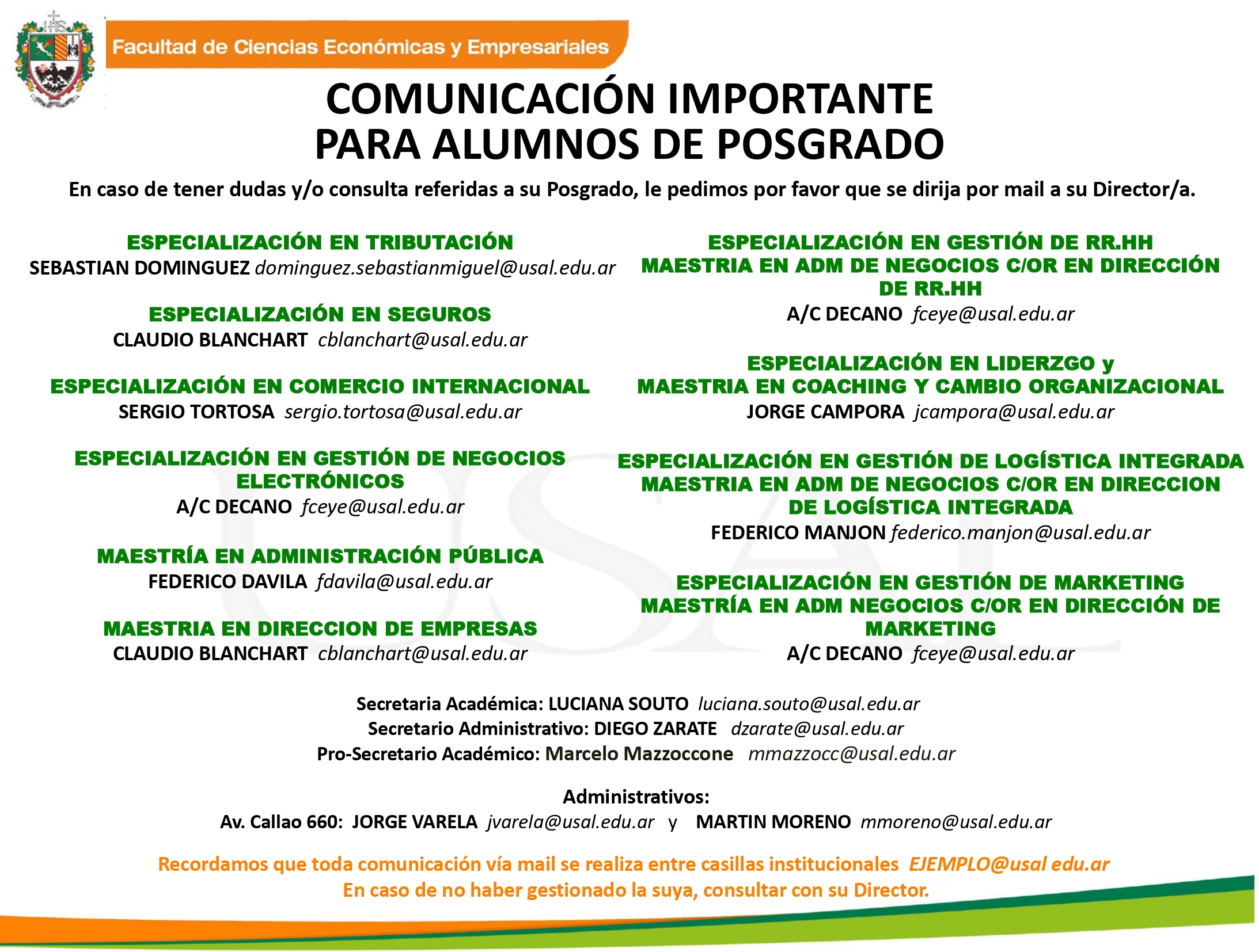 * Posgrados (todos), Administración de Recursos Humanos, Administración y Comercialización: Lorena Morsella lmorsell@usal.edu.ar